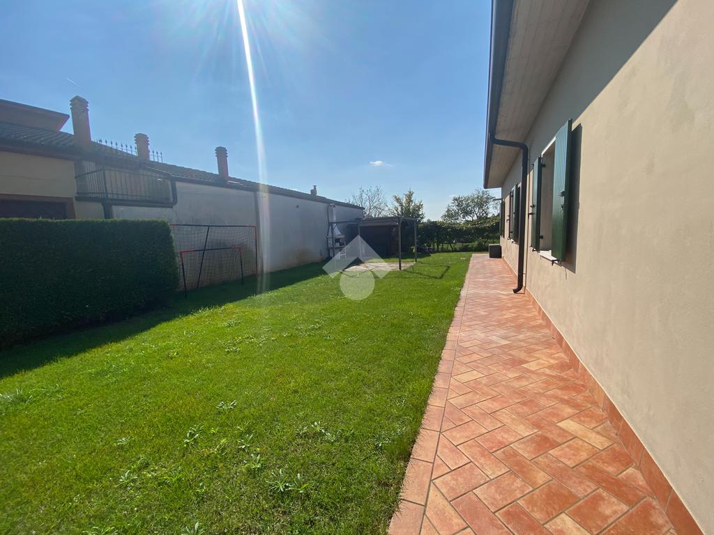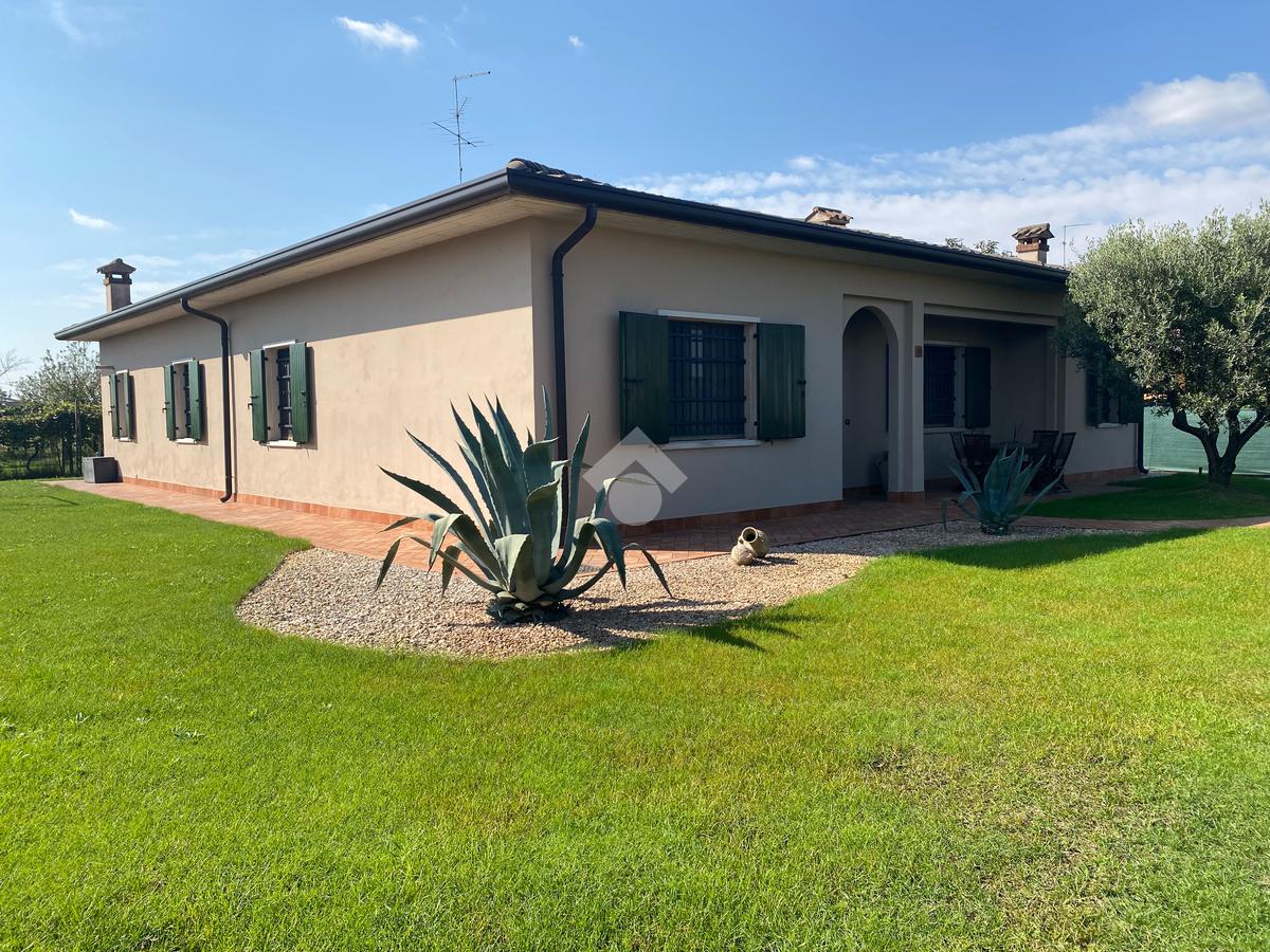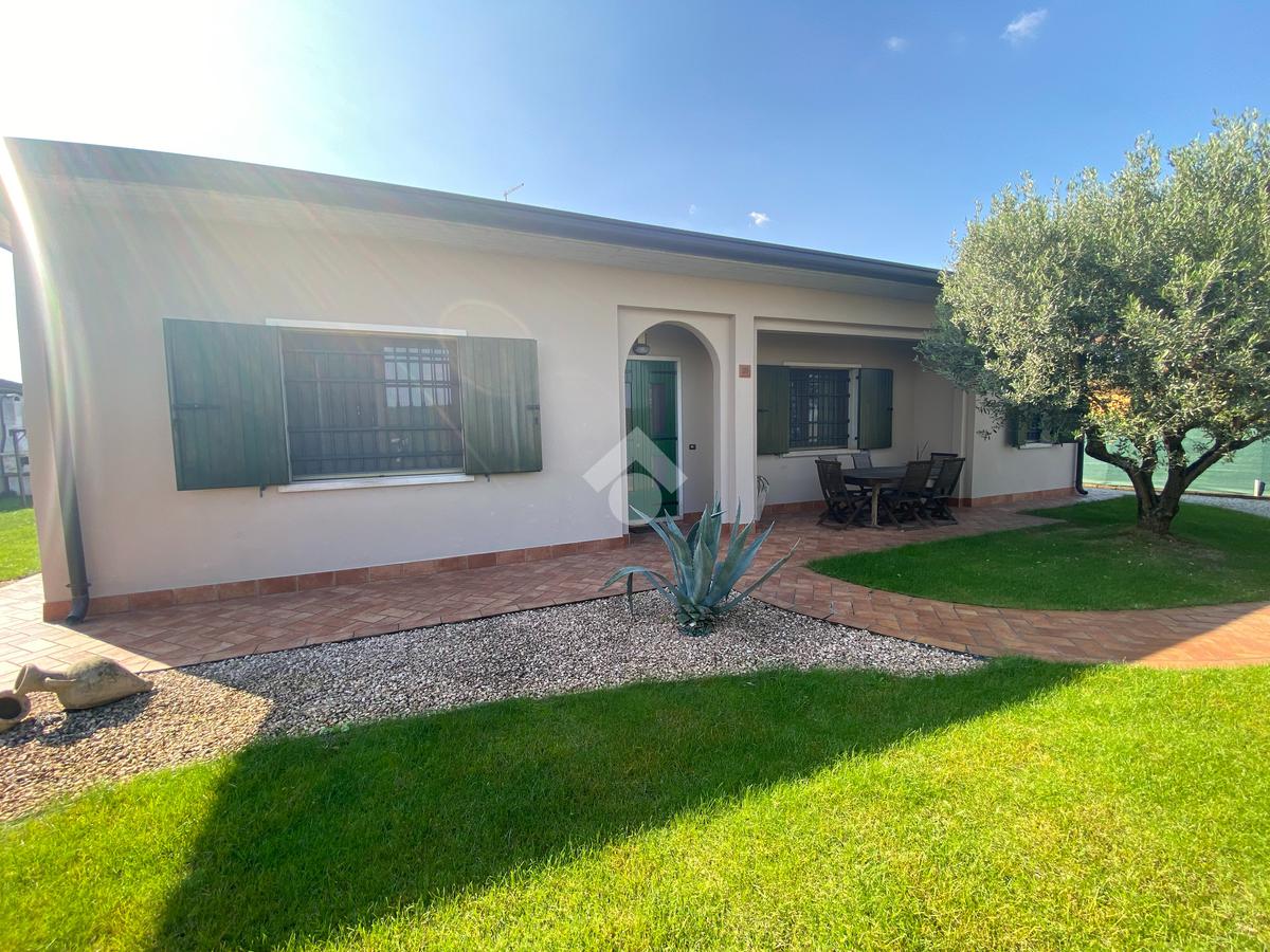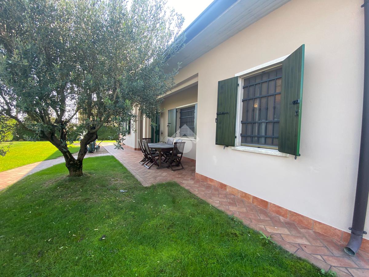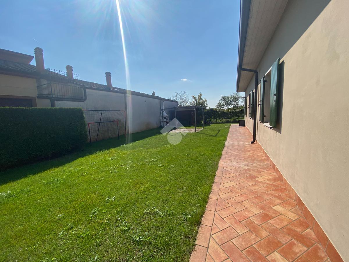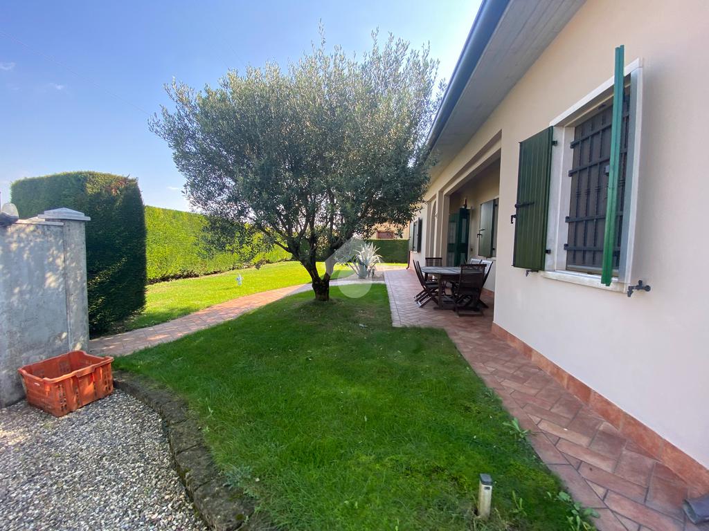 Casa singola su unico livello con ingresso, soggiorno, cucina abitabile, tre camere da letto e due bagni. Garage doppio e splendido giardino. Con riscaldamento a pavimento. Libera da subito e arredata.