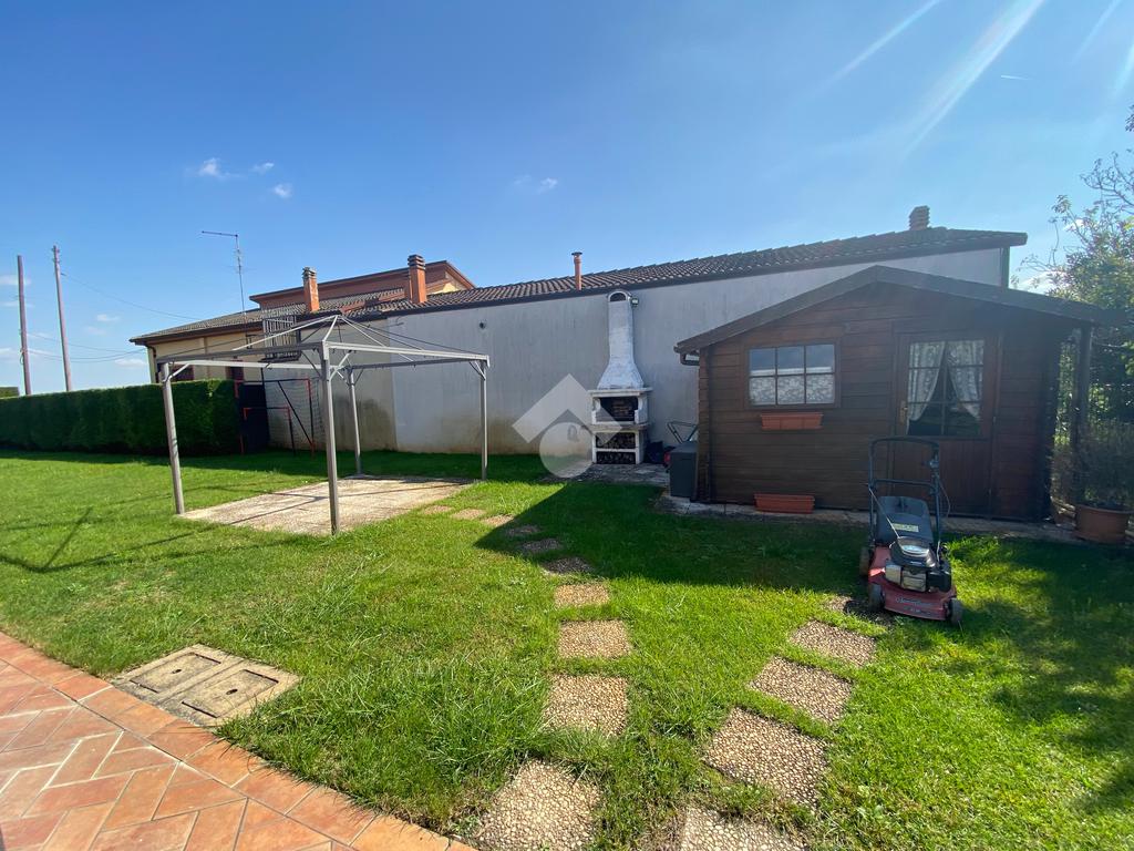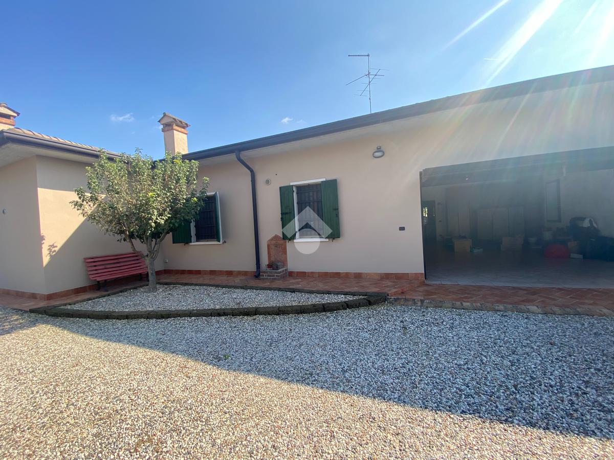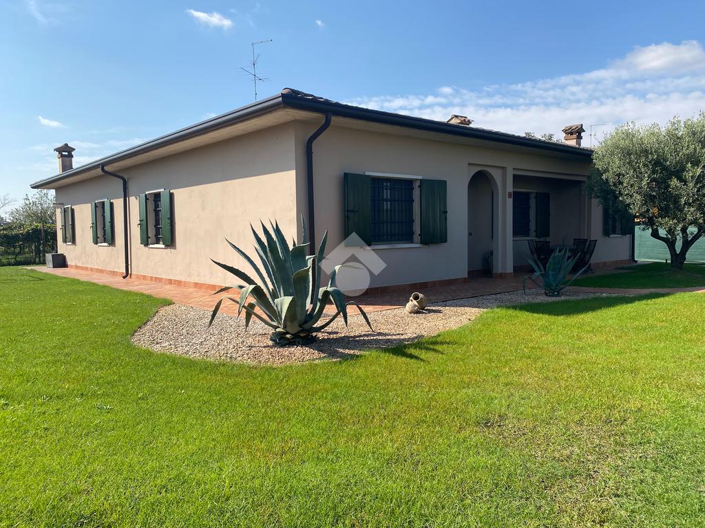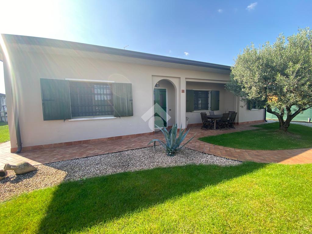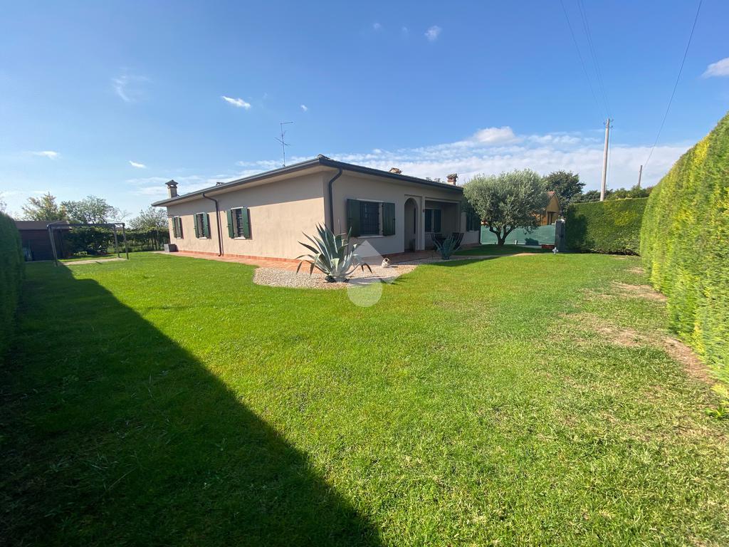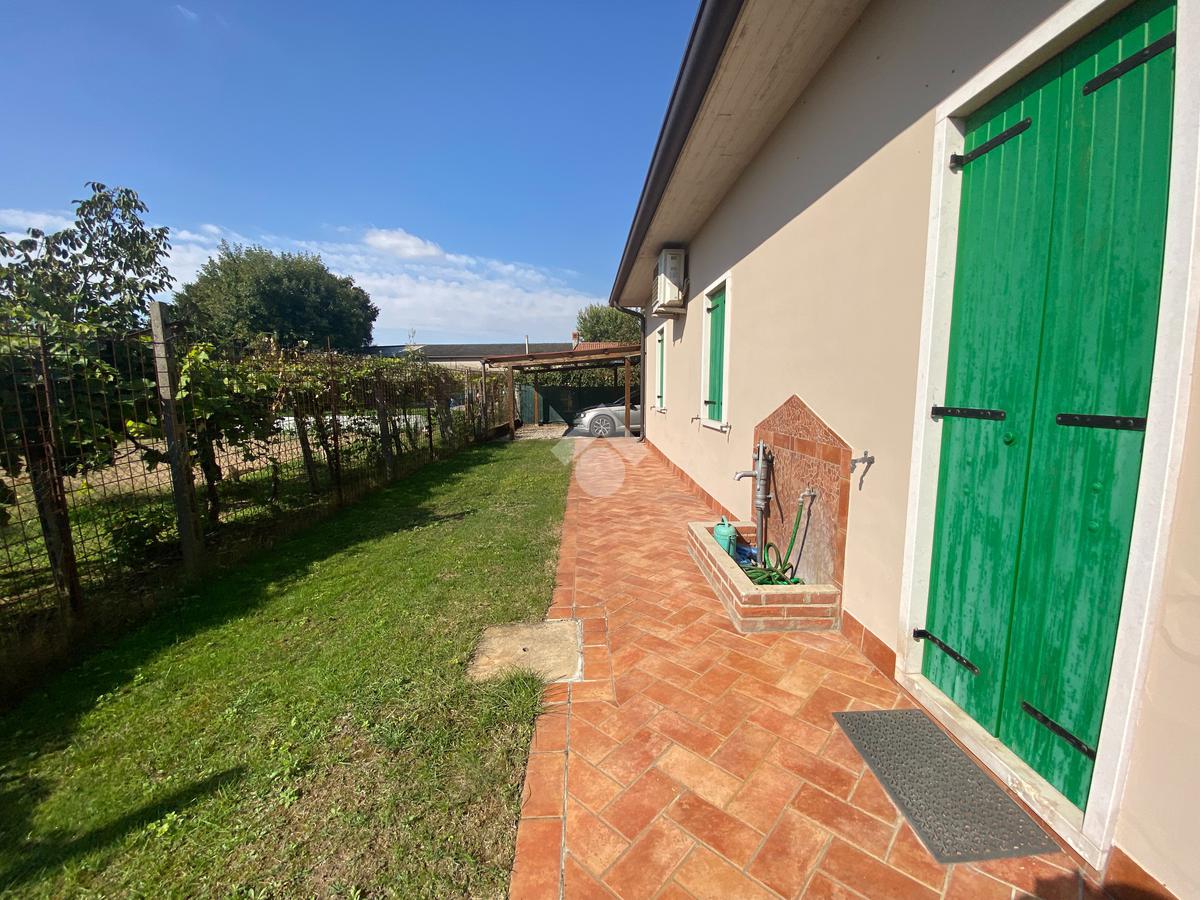 Casa singola su unico livello con ingresso, soggiorno, cucina abitabile, tre camere da letto e due bagni. Garage doppio e splendido giardino. Con riscaldamento a pavimento. Libera da subito e arredata.