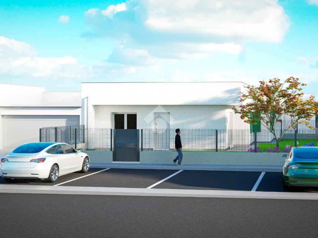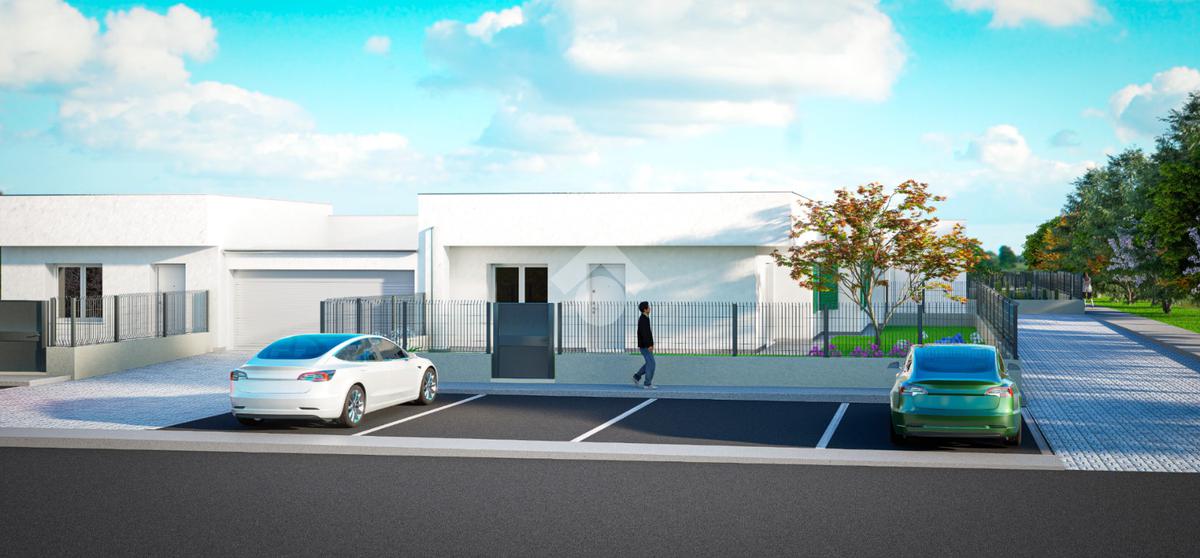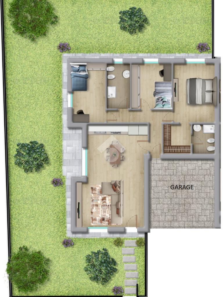 VILLETTA C1 mq 124 di prossima costruzione: SU UN UNICO LIVELLO soggiorno-cucina, una camera padronale con cabina e bagno, due camere doppie e bagno. Garage doppio e giardino. Completamente elettrica.
