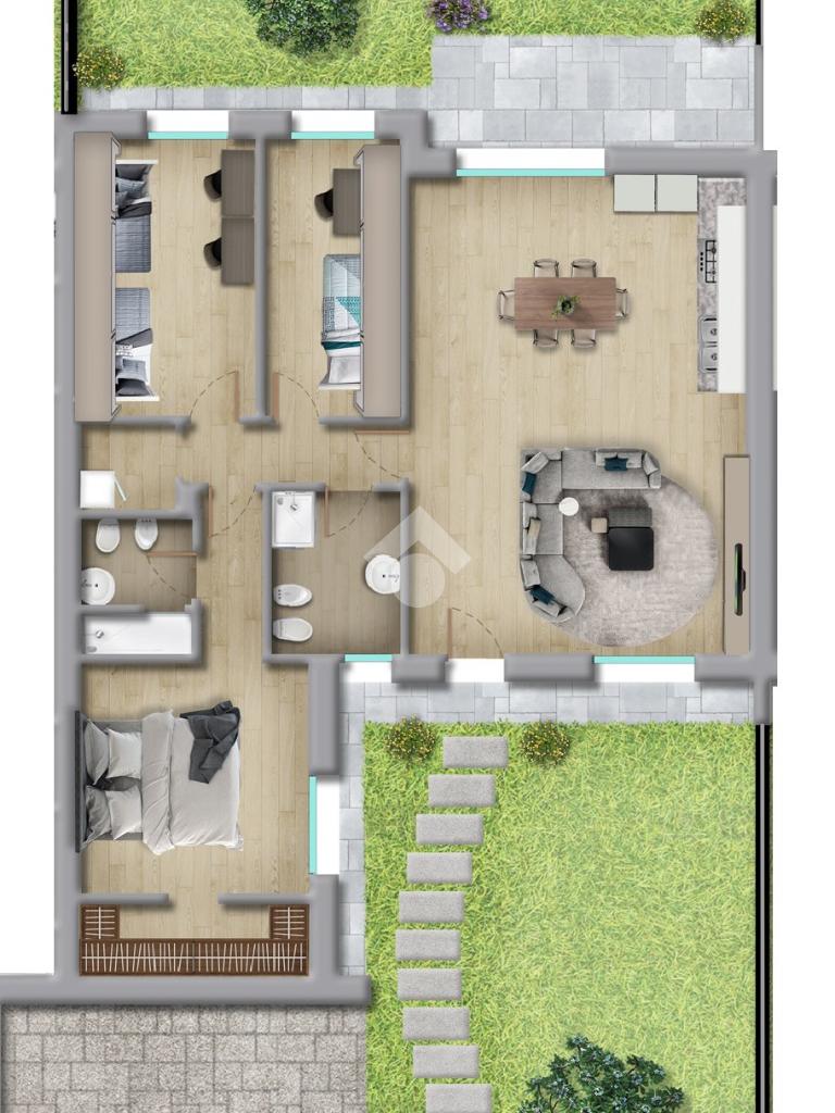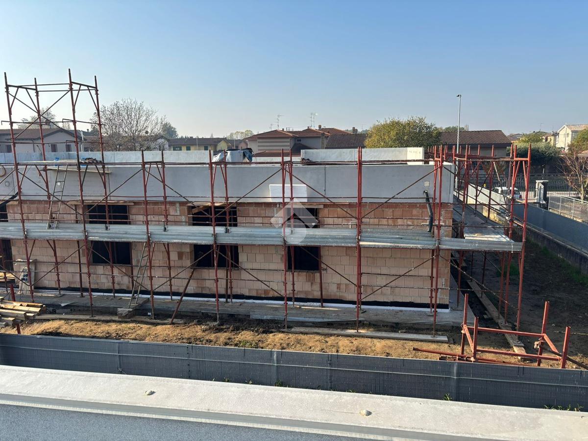 VILLETTA A2 mq 116 di prossima costruzione: SU UN UNICO LIVELLO soggiorno-cucina, una camera padronale con cabina e bagno, due camere, ripostiglio e bagno. Garage doppio e giardino. Completamente elettrica.